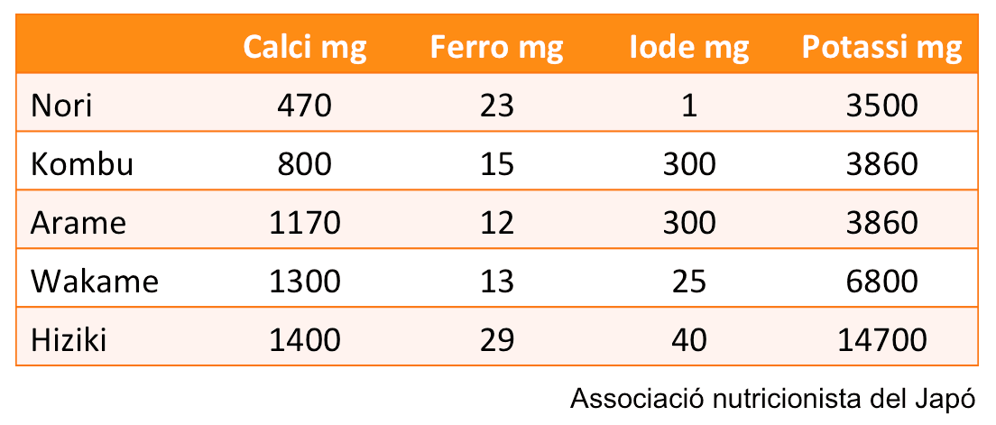 Les algues són les verdures del mar, contenen més minerals que les terrestres i a més alcalinitzen la sang. Són riques en calci, potassi, ferro, iode i magnesi. En 100g d’alga Hiziki, per exemple, hi ha 1400mg de calci.