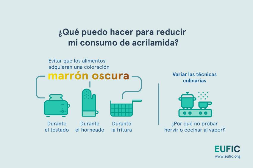 La principal mesura per evitar l’acrilamida és cuinar adequadament els aliments i no excedir-se en el torrat o fregit de productes com pa, patates i arrebossats, és a dir daurar-los lleugerament sense que l’aliment arribi agafar un color marró fosc, daurat però no passat.