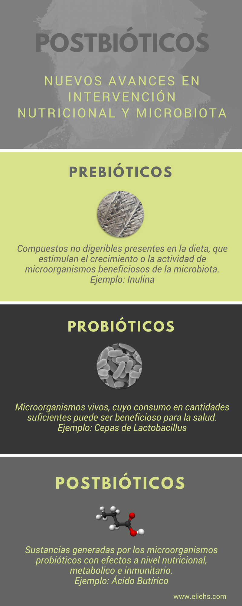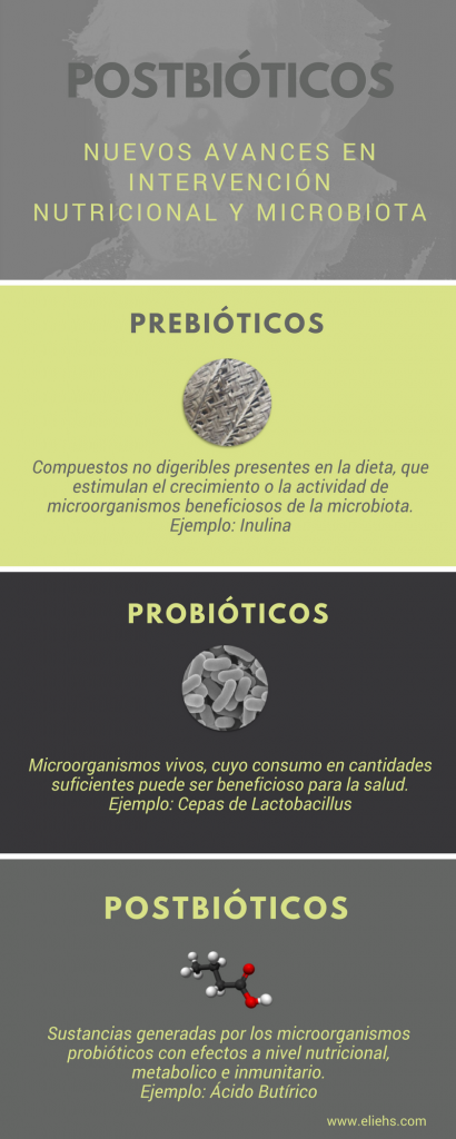 Els postbiòtics es defineixen com les substàncies produides pels microorganismes probiòtics que tenen efectes beneficiosos sobre la salut a nivell nutricional, metabòlic i immunitari. És a dir, molècules produides principalment pels bacteris de la microbiota intestinal que tenen una activitat beneficiosa per la nostra salut.
